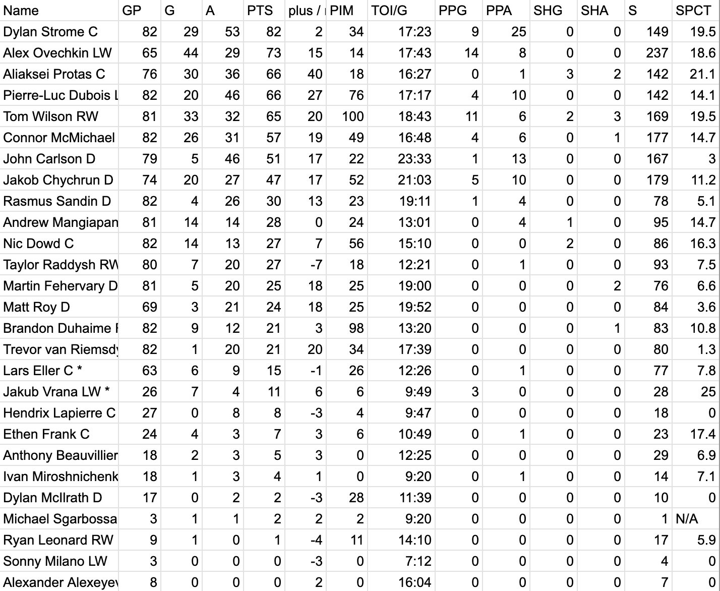 Below is the core dataset used for analysis, showing the Washington Capitals player statistics for the 2024–25 NHL season.