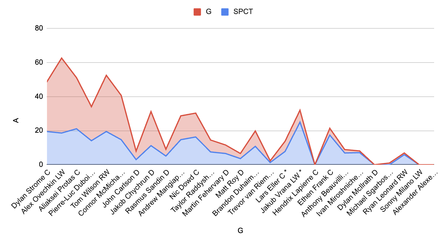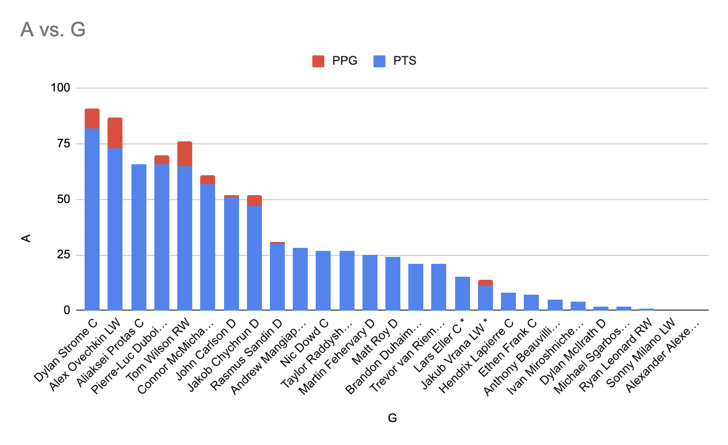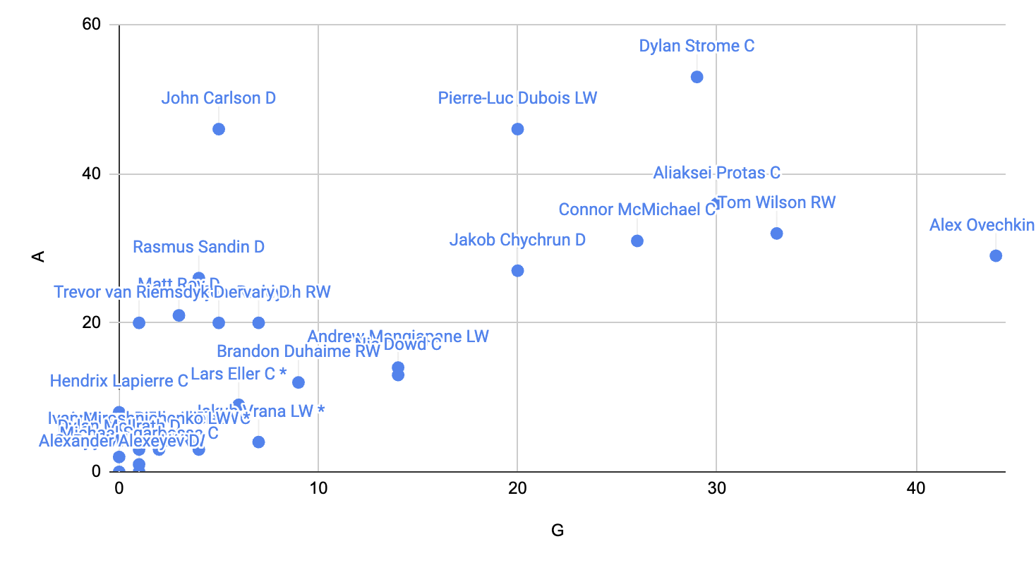 This chart shows that Alex Ovechkin is still the team’s dominant goal scorer, far ahead of his peers, while Dylan Strome stands out as the most balanced player — leading both in assists and total points. The distribution suggests a team heavily reliant on top-line forwards for offensive production.